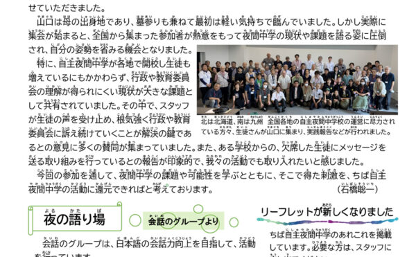 2025年9月24日学習者・スタッフより(がくしゅうしゃ・すたっふより)スタッフO 全国交流集会報告(ぜんこくこうりゅうしゅうかいほうこく)石橋いしばし 聡一そういち 9月くがつ5日いつか、6日むいかに、山口やまぐちで開ひらかれた夜間中学やかんちゅうがく増設ぞうせつ運動うんどう全国交流集会ぜんこくこうりゅうしゅうかいにスタッフすたっふ、学習者がくしゅうしゃの […]