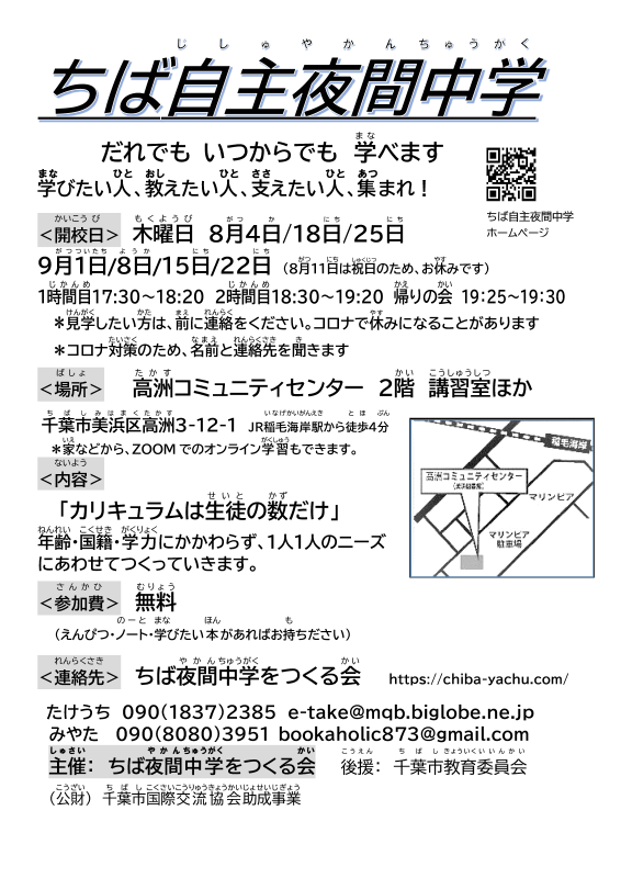 2022年7月29日 / 最終更新日 : 2022年7月29日 スタッフO お知らせ(おしらせ) 千葉市(ちばし)の公立夜間中学(こうりつやかんちゅうがく)の個別相談(こべつそうだん)がはじまります くわしくは千葉市ちばしホームページほーむぺーじをごらんください。 千葉市:夜間中学