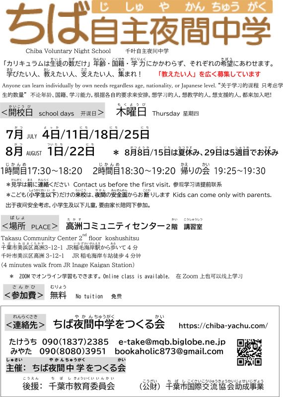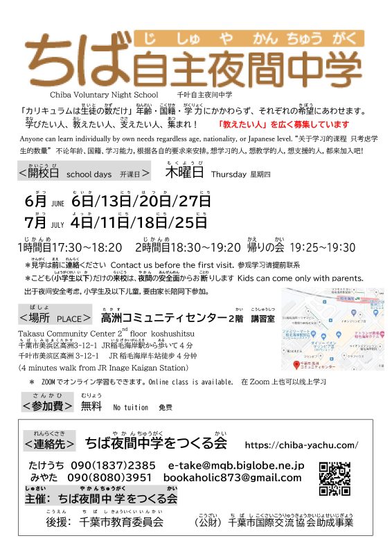2024年6月24日 / 最終更新日 : 2024年6月24日 kayokomatsui お知らせ(おしらせ) ピースフェアに参加(さんか)しました 2024年6月19日(水)~23日(日) 千葉市中央区(ちばしちゅうおうく)きぼーる1階(かい)アトリウムで「千葉市平和(ちばしへいわ)のための戦争展(せんそうてん)ピースフェア2024 in 千葉(ちば)」が開かれました。ちば夜間中学(やかんちゅうがく)をつくる会(かい)は今年(ことし)も展示(てんじ)で参加(さんか)しました。5周年記念誌(しゅうねんきねんし)から作文(さくぶん)をいくつか選(えら)んで、こどもたちのイラストと一緒(いっしょ)にレイアウトしました。