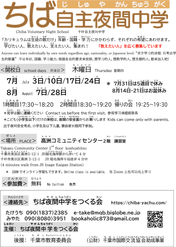 2025年6月11日 / 最終更新日 : 2025年6月11日 スタッフO 日々の活動(ひびのかつどう) 第7回(だいななかい)総会(そうかい)終(お)わりました 5月29日(木)ごがつ29にち(もく)18時じから20時じ、高洲たかすコミュニティーセンターこみゅにてぃーせんたーで、第7回だいななかいちば夜間中学ちばやかんちゅうがくをつくる会かい定期総会ていきそうかいが開ひらかれました。参加者さんかしゃは26名めいでした。2024年度ねんどの活動報告かつどうほうこく、決算報告けっさんほうこく及および監査報告かんさほうこく、2025年度ねんどの活動計画案かつどうけいかくあん、予算案よさんあん、役員案やくいんあん、すべて承認しょうにんされました。 後半こうはんは、今年ことしやってみたいイベントいべんとについて話はなし合あいました。校外学習こうがいがくしゅう、ミニ忘年会みにぼうねんかいなど、やりたいことがたくさんあります。 総会(そうかい)の様子(ようす) 楽(たの)しいイベント(イベント)の相談(そうだん)
