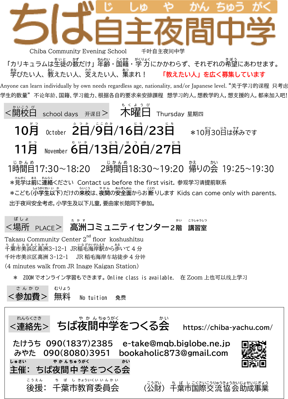 千葉市(ちばし)美浜区(みはまく)にある自主夜間中学(じしゅやかんちゅうがく) / Chiba Voluntary Night School