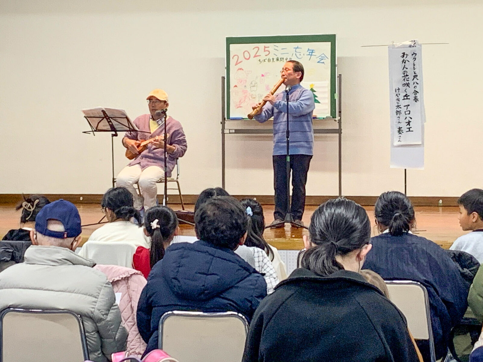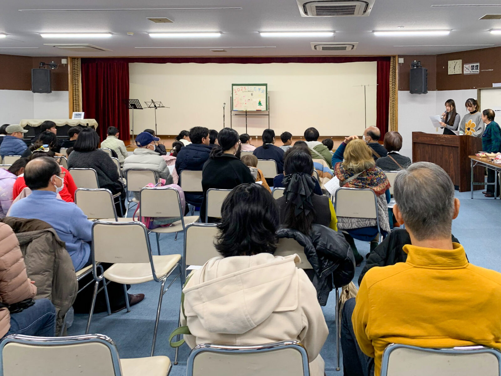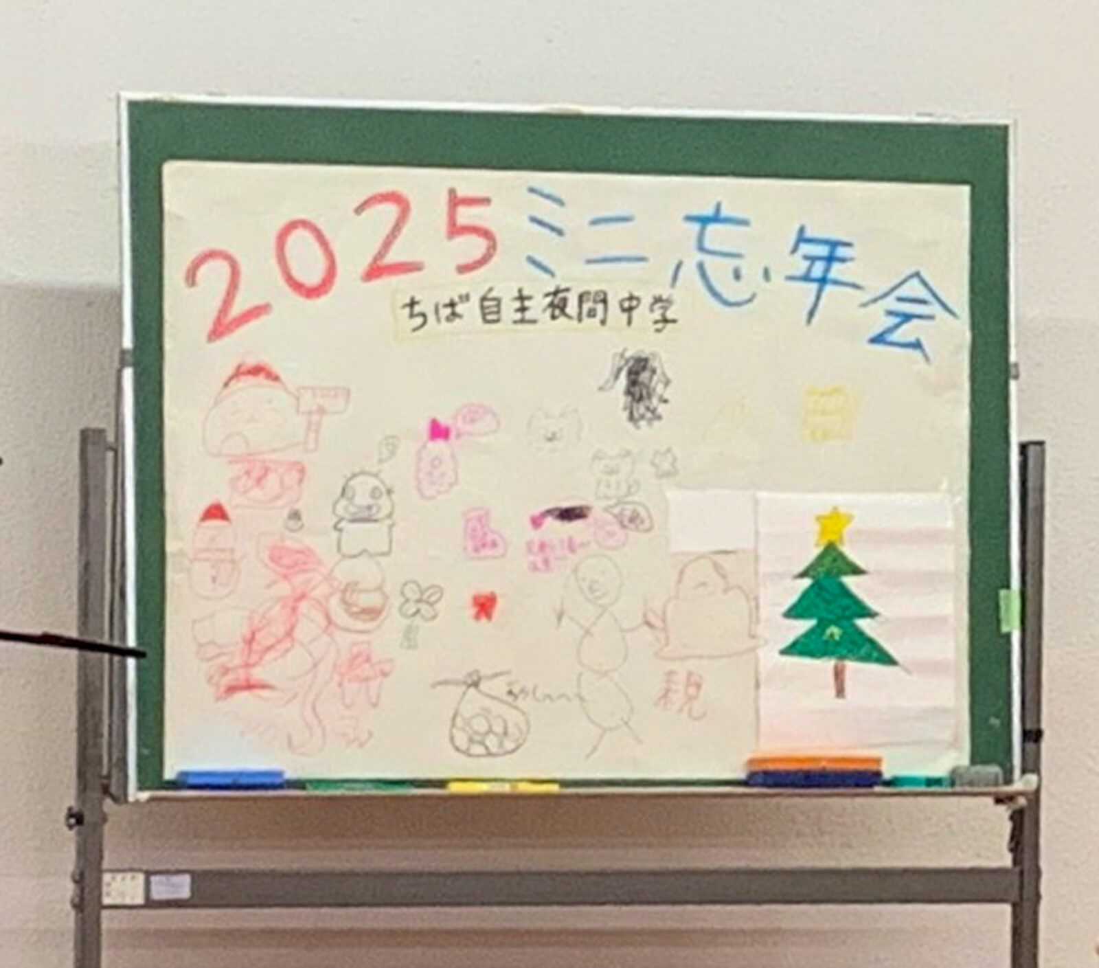2025年12月25日 / 最終更新日 : 2025年12月25日 スタッフO 日々の活動(ひびのかつどう) ミニ忘年会(みにぼうねんかい)を開催(かいさい)しました 2025年にせんにじゅうごねん12月じゅうにがつ18日じゅうはちにち高洲たかすコミュニティセンターこみゅにてぃせんたー3階さんかいホールほーるにて こどもたちの絵えが出迎でむかえてくれました 今年ことしの自主夜間中学じしゅやかんちゅうがくはミニみに忘年会ぼうねんかいで終了しゅうりょうしました。昨年さくねんに引ひき続つづき、学習者がくしゅうしゃを中心ちゅうしんに、歌うたや楽器演奏がっきえんそうの発表はっぴょうと、恒例こうれいのビンゴびんご大会たいかいをしました。参加者さんかしゃは70名ななじゅうめい、ご家族かぞくそろっての参加さんかもあり、にぎやかに楽たのしく過すごしました。 司会しかいは中国ちゅうごくからの大学院生だいがくいんせいふたりです 竹内たけうち代表だいひょうのはじめの言葉ことば ウクレレうくれれと尺八しゃくはちの合奏がっそう「みかんの花はな咲さく丘おか」「アロハオエあろはおえ」皆みんなで歌うたいました スタッフすたっふの絵えの展示てんじ 学習者がくしゅうしゃの絵えの展示てんじ ビンゴびんごの景品けいひん、おとなも迷まよう おみやげのお菓子かし 終おわりの言葉ことばは大学生だいがくせいのスタッフすたっふが話はなしてくれました。皆みんなでそろって「良よいお年としを!」
