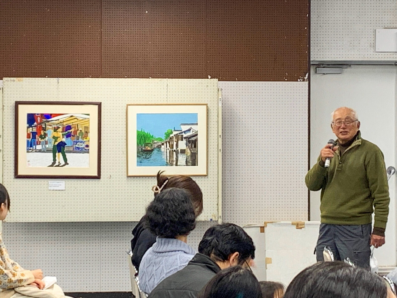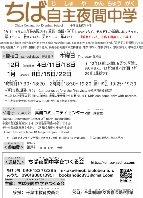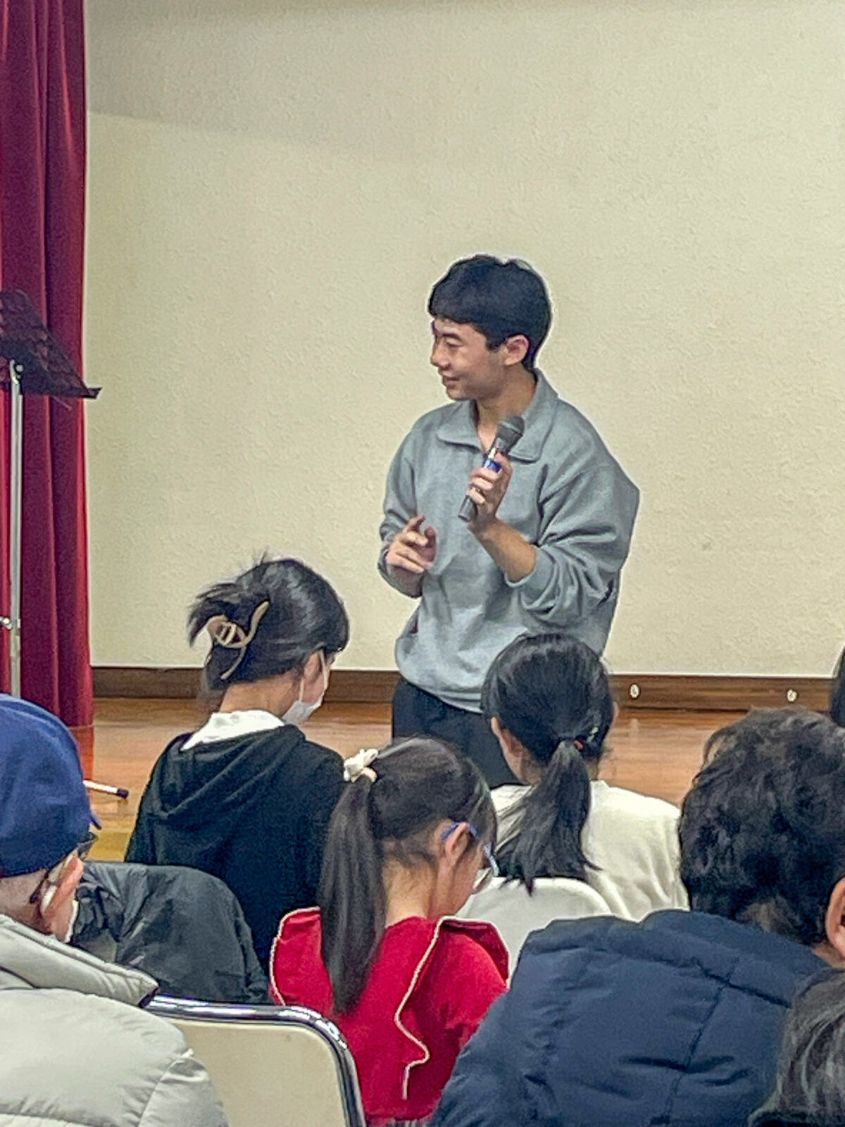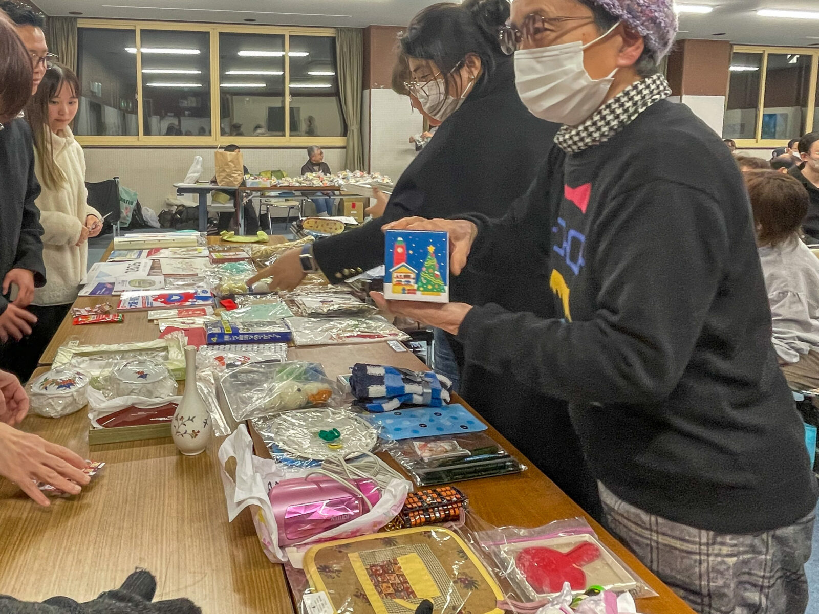 2025年12月25日 / 最終更新日 : 2025年12月25日 スタッフO 日々の活動(ひびのかつどう) ミニ忘年会(みにぼうねんかい)を開催(かいさい)しました 2025年にせんにじゅうごねん12月じゅうにがつ18日じゅうはちにち高洲たかすコミュニティセンターこみゅにてぃせんたー3階さんかいホールほーるにて こどもたちの絵えが出迎でむかえてくれました 今年ことしの自主夜間中学じしゅやかんちゅうがくはミニみに忘年会ぼうねんかいで終了しゅうりょうしました。昨年さくねんに引ひき続つづき、学習者がくしゅうしゃを中心ちゅうしんに、歌うたや楽器演奏がっきえんそうの発表はっぴょうと、恒例こうれいのビンゴびんご大会たいかいをしました。参加者さんかしゃは70名ななじゅうめい、ご家族かぞくそろっての参加さんかもあり、にぎやかに楽たのしく過すごしました。 司会しかいは中国ちゅうごくからの大学院生だいがくいんせいふたりです 竹内たけうち代表だいひょうのはじめの言葉ことば ウクレレうくれれと尺八しゃくはちの合奏がっそう「みかんの花はな咲さく丘おか」「アロハオエあろはおえ」皆みんなで歌うたいました スタッフすたっふの絵えの展示てんじ 学習者がくしゅうしゃの絵えの展示てんじ ビンゴびんごの景品けいひん、おとなも迷まよう おみやげのお菓子かし 終おわりの言葉ことばは大学生だいがくせいのスタッフすたっふが話はなしてくれました。皆みんなでそろって「良よいお年としを!」