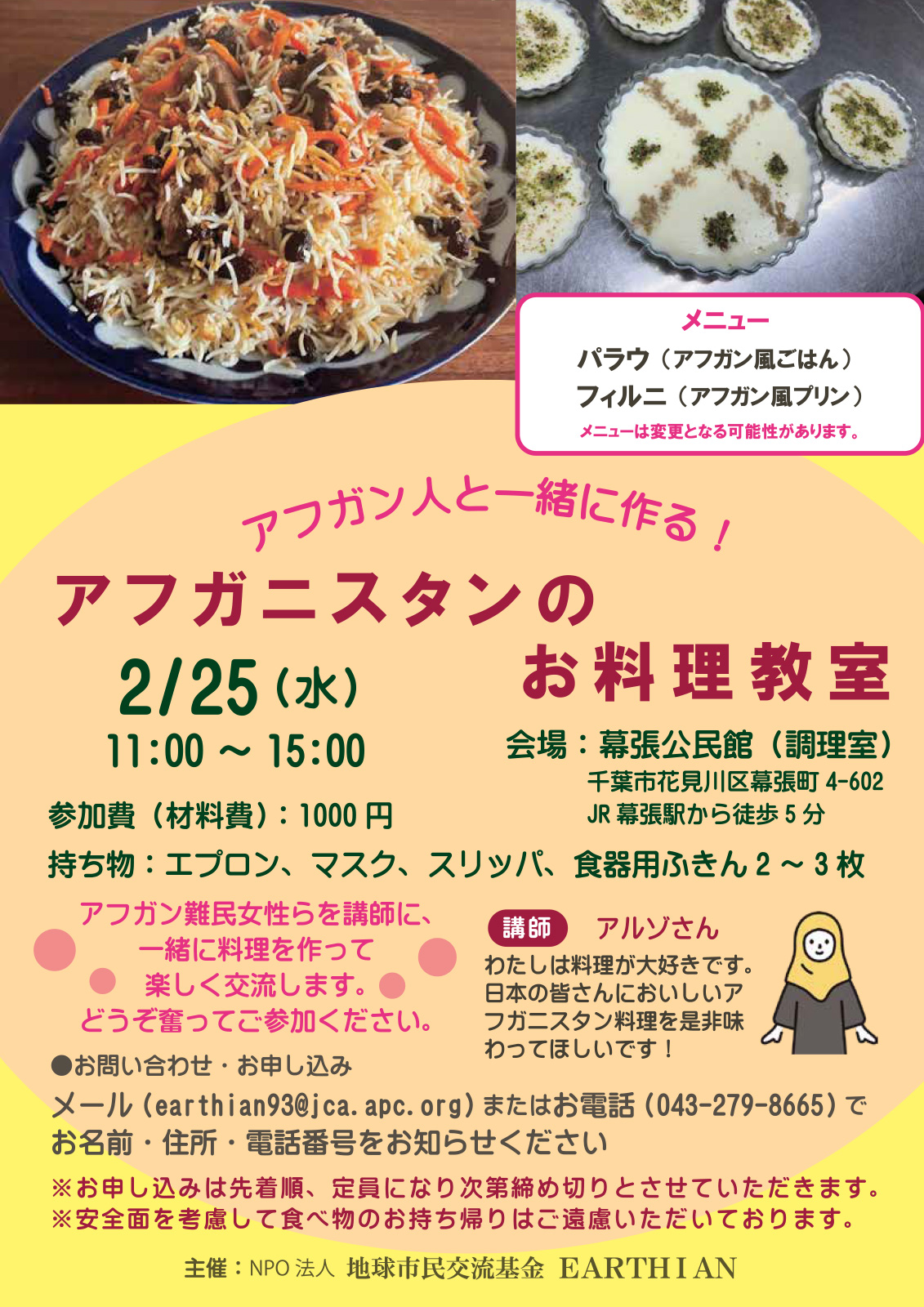 NPO法人 地球市民交流基金 EARTHIAN(アーシアン)が主催した「アフガニスタンのお料理教室」に参加しました。