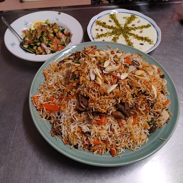 パラウ(アフガン風ごはん)は、骨付きの牛肉をスパイスと調味料で柔らかく煮込み、油で炒めたニンジン・干しブドウ、アフガニスタンのコメ(バスマティライス)と一緒に蒸したものです。